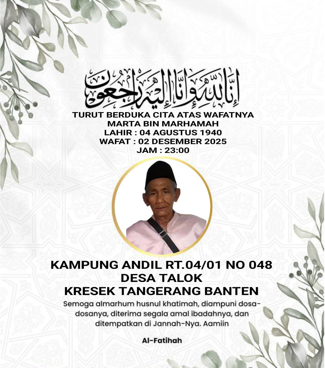 “Atas nama pribadi dan keluarga besar Media Analisa Siber di Kabupaten Tangerang, saya, Nurhaedi (Nedi), menyampaikan turut berduka cita sedalam-dalamnya atas wafatnya almarhum Marta bin Marhamah. Beliau adalah sosok yang dihormati, penuh keteladanan, dan memiliki hati yang tulus dalam bermasyarakat.