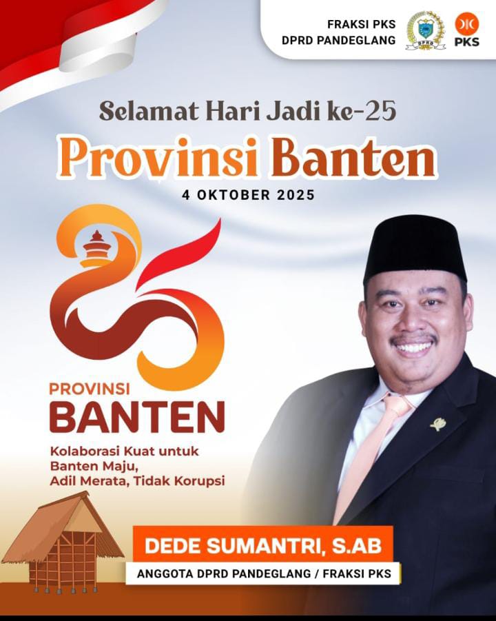 Anggota DPRD Kabupaten Pandeglang dari Fraksi Partai Keadilan Sejahtera (PKS), Dede Sumantri, S.AB, menyampaikan ucapan selamat Hari Jadi ke-25 untuk Provinsi Banten yang diperingati pada Sabtu, 4 Oktober 2025.