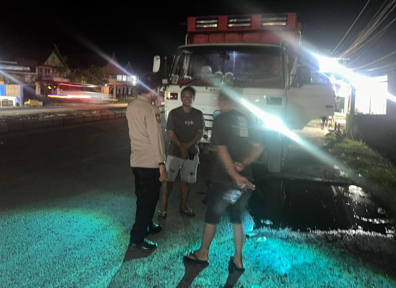 Pangkep-Patroli Polsek Ma’rang Polres Pangkep beri himbauan kepada sopir truk yang parkir di badan jalan. Himbauan secara humanis dilakukan untuk mengantisipasi kerawanan terjadinya kecelakaan serta menjaga kelancaran arus lalu lintas, Senin (20/10/2025) malam.