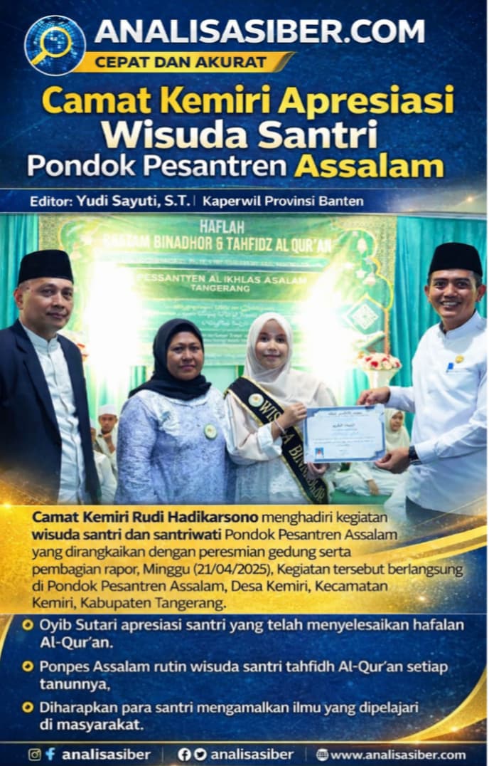 TANGERANG,|Analisasiber.com – Camat Kemiri, Rudi Hadikarsono, S.H., M.Si., menghadiri kegiatan Wisuda Santri dan Santriwati Pondok Pesantren Assalam yang dirangkaikan dengan peresmian gedung baru serta pembagian rapot, Minggu (21/12/2025). Kegiatan berlangsung khidmat di lingkungan Pondok Pesantren Assalam, Desa Kemiri, Kecamatan Kemiri, Kabupaten Tangerang.