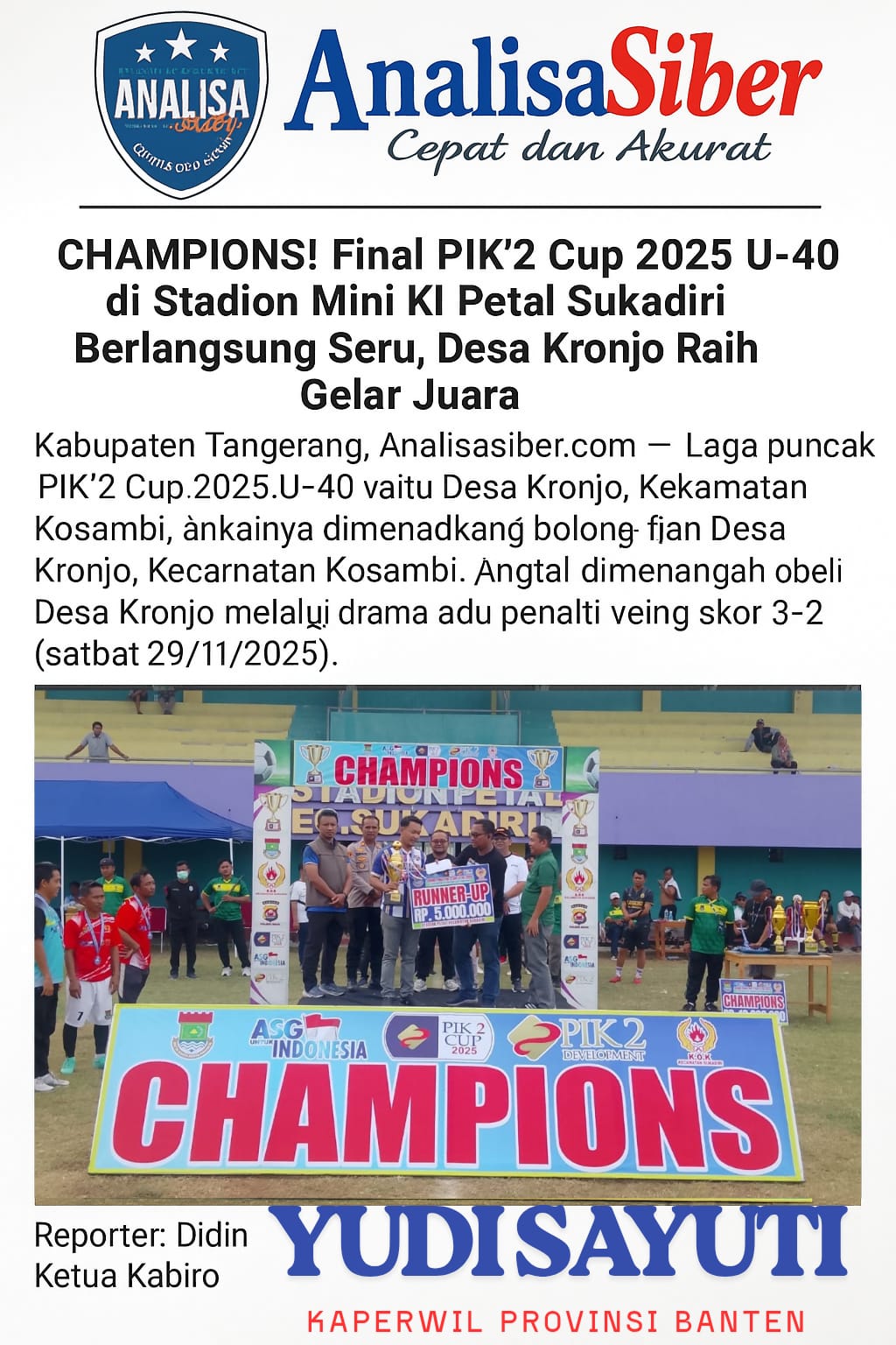 Kabupaten Tangerang, Analisasiber.com — Laga puncak PIK’2 Cup 2025 U-40 yang digelar di Stadion Mini KI Petal, Kecamatan Sukadiri, Sabtu (29/11/2025), berlangsung dramatis dan penuh tensi tinggi. Final yang mempertemukan Desa Kronjo (Kecamatan Kronjo) kontra Desa Belimbing (Kecamatan Kosambi) berakhir dengan kemenangan Desa Kronjo melalui adu penalti 3–2, setelah kedua tim bermain imbang 1–1 selama 2×25 menit.