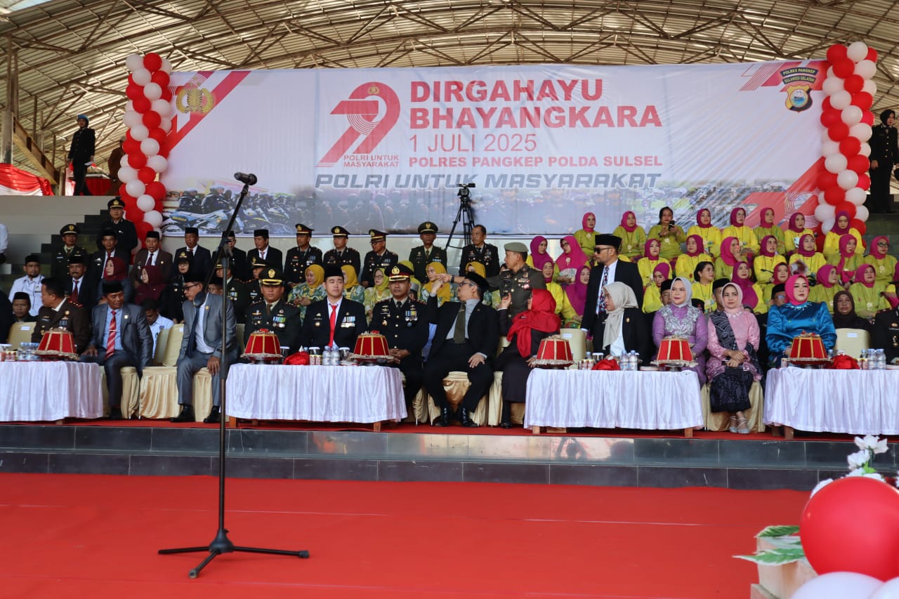 Upacara dipimpin langsung oleh Kapolres Pangkep, AKBP Muhammad Husni Ramli, selaku inspektur upacara. Hadir dalam kegiatan tersebut jajaran Forkopimda, antara lain Bupati Pangkep DR. H. Muhammad Yusran Lalogau, Ketua DPRD, Dandim 1421/Pangkep, Kajari, dan Ketua Pengadilan Negeri, serta para tokoh masyarakat, pemuda, pelajar, dan pelaku UMKM.