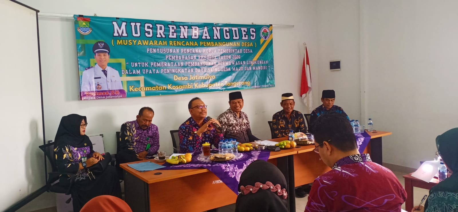 Musyawarah Perencanaan Pembangunan Desa (MusrenbangDes) untuk penyusunan Rencana Kerja Pemerintah Desa (RKPDes) Tahun Anggaran 2026 serta pembahasan data usulan tahun 2027 digelar di Aula Kantor Desa Jatimulya, Kecamatan Kosambi, Kabupaten Tangerang, pada Kamis (02/10/2025).