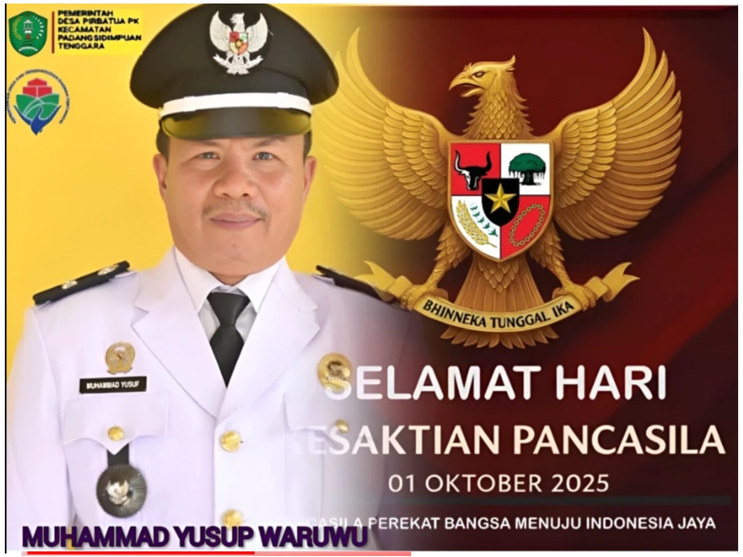 Padangsidimpuan, Sumut: analisasiber.com, – Dalam rangka memperingati Hari Kesaktian Pancasila yang jatuh pada 1 Oktober 2025, Bpk Muhammad Yusup selaku Kepala Desa Purbatua Pijorkoling Kecamatan Padangsidimpuan Tenggara Kota Padangsidimpuan Sumatera Utara (Sumut), menyampaikan ucapan selamat sekaligus ajakan kepada seluruh masyarakat untuk terus menanamkan nilai-nilai Pancasila dalam kehidupan sehari-hari.