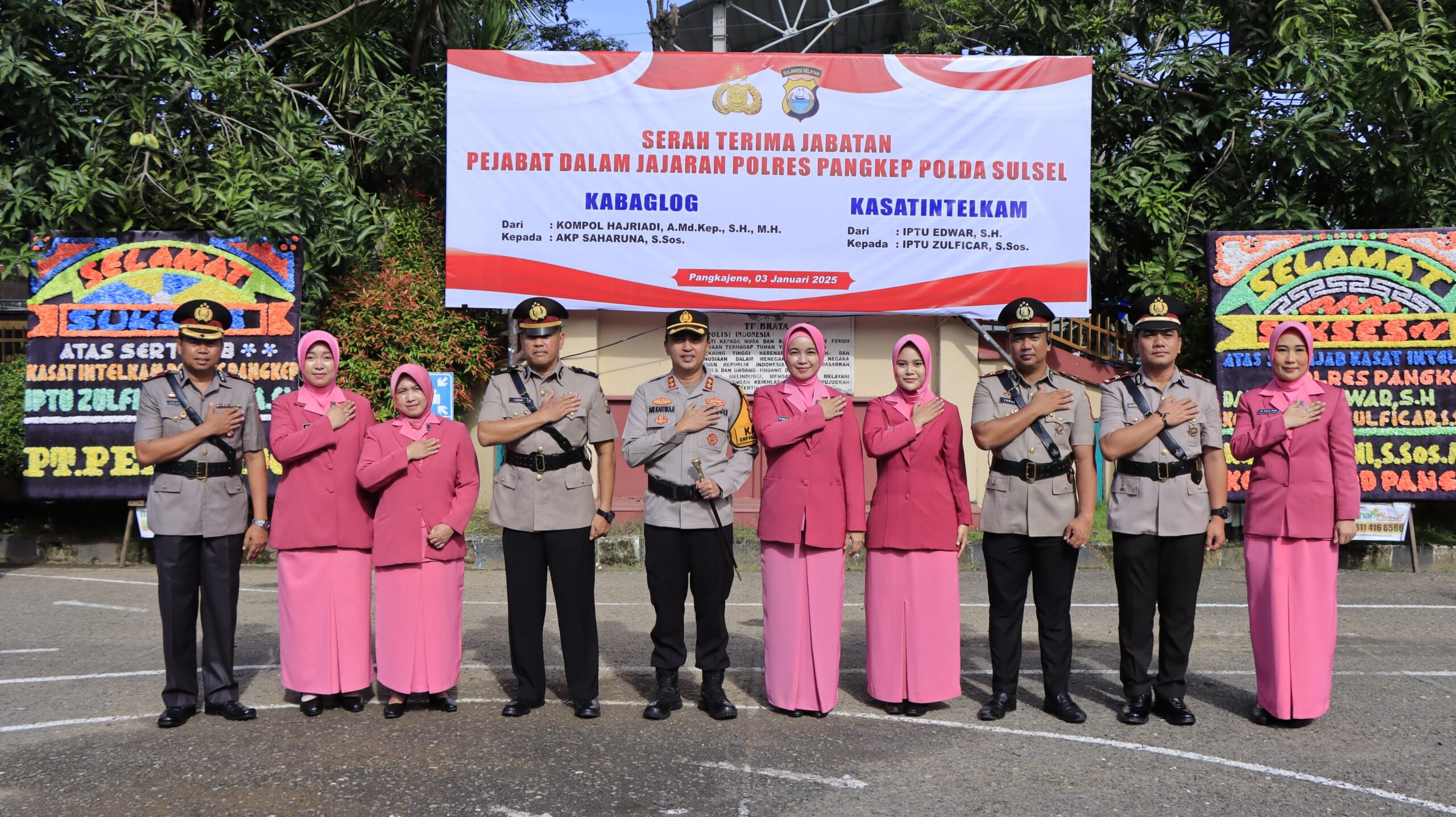 Adapun Pejabat yang Diserahterimakan yakni Kompol Hajriadi, A.Md.Kep., S.H., M.H., kepada AKP Saharuna, S.Sos., sebagai Kabag Logistik Polres Pangkep dan Iptu Edward, S.H., kepada Iptu Zulficar, S.Sos., M.Si., sebagai Kasat Intelkam Polres Pangkep.