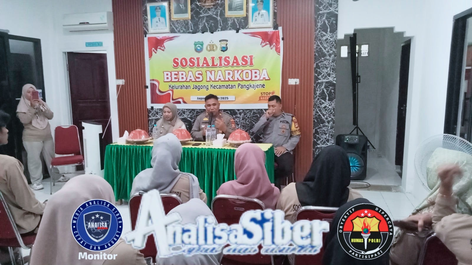 ANALISASIBER.COM. Pangkajene – Iptu Syamsir, SH, Kapolsek Pangkajene yang didamping Bhabinkamtibmas Aipda Handri Nurcahyo, SH, menjadi Nara sumber, pada giat sosialisasi Penyalahgunaan Mencegah Narkoba di Kantor Kelurahan Jagong Kec. Pangkajene Kab. Pangkep, Rabu (23/07/2005).