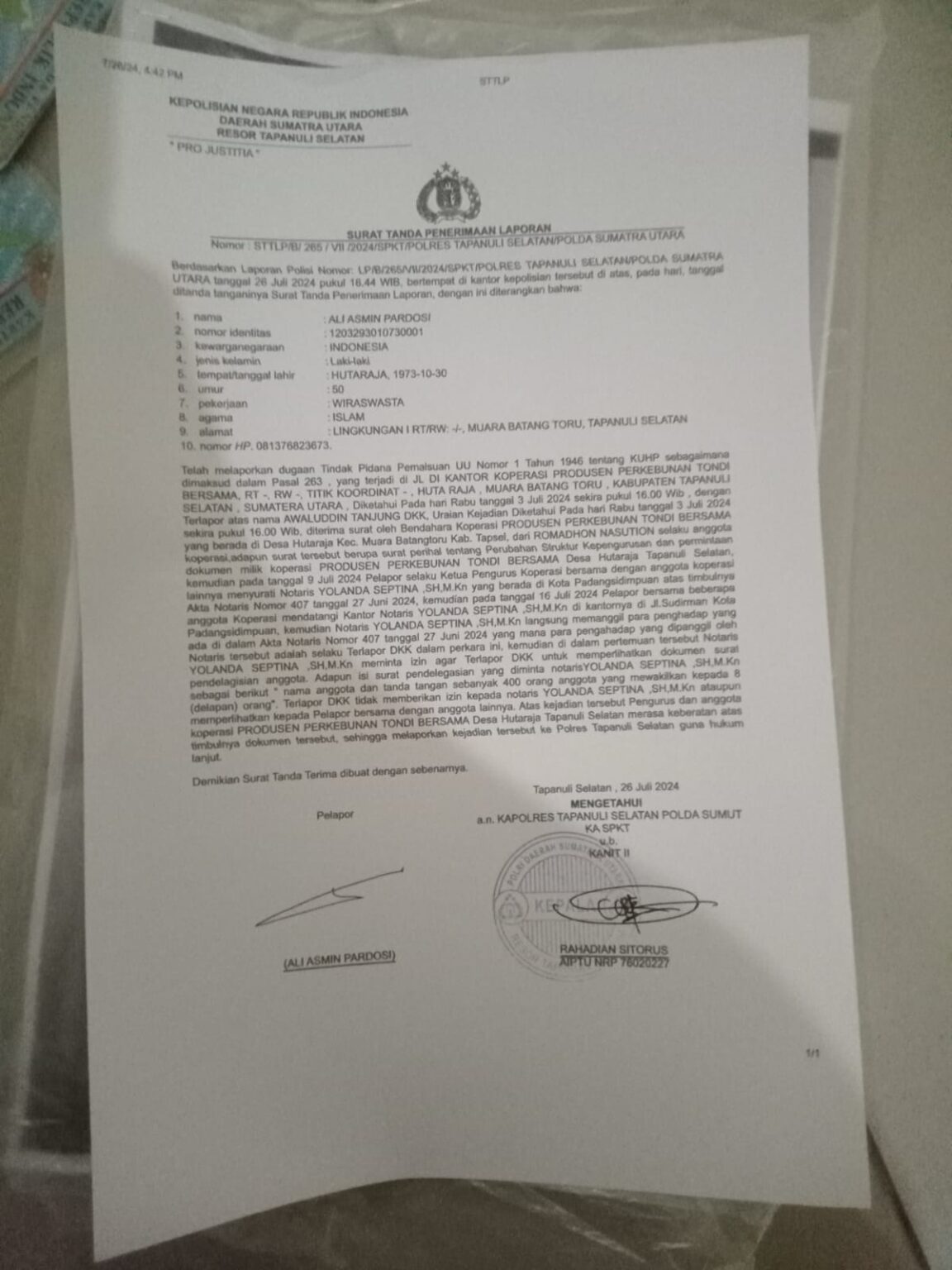Bukti laporan yang diterima oleh media ini sesuai Laporan Polisi Nomor: LP/B/265/VW/2024/SPKT/POLRES TAPANULI SELATAN/POLDA SUMATRA UTARA. namun penyelidikan dihentikan dengan surat bernomor B/2210/VII/2025 tertanggal 14 Juli 2025.Dalam kasus serupa, pemalsuan tanda tangan dapat dijerat dengan Pasal 263 KUHP, yang mengatur tentang pemalsuan surat yang dapat menimbulkan kerugian bagi orang lain. Pemalsuan tanda tangan dapat terjadi dalam berbagai konteks, termasuk bisnis, politik, dan pemerintahan.