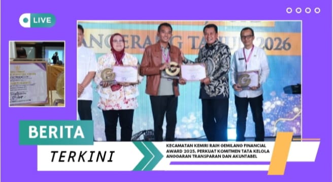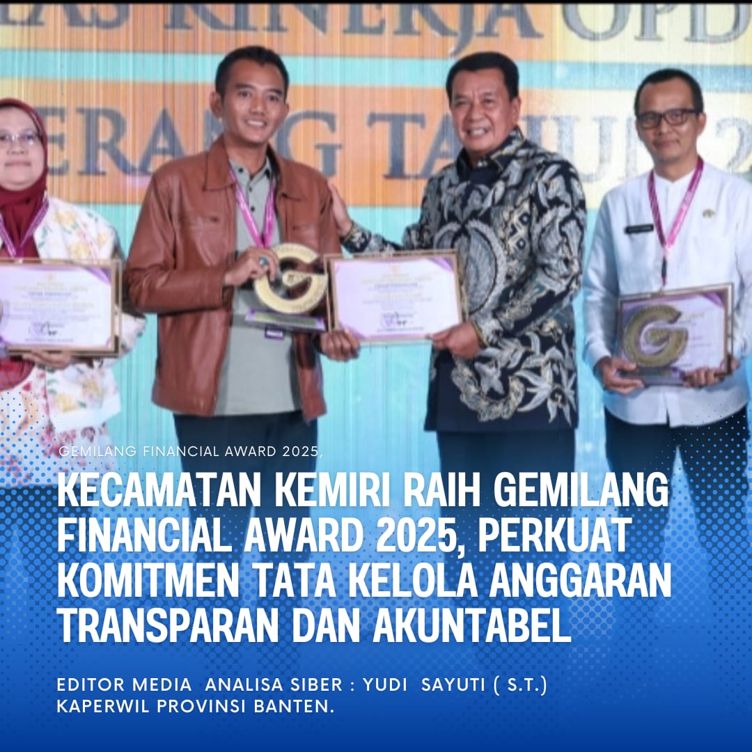 Kemiri, Kabupaten Tangerang,| Analisasiber.com  —Kecamatan Kemiri kembali menorehkan prestasi membanggakan di tingkat Kabupaten Tangerang. Pada Tahun 2025, Pemerintah Kecamatan Kemiri berhasil meraih Gemilang Financial Award 2025, sebuah penghargaan bergengsi yang menjadi bukti nyata komitmen kuat dalam menerapkan tata kelola anggaran yang transparan, akuntabel, dan berorientasi pada kinerja.