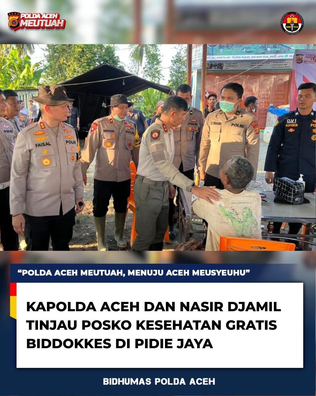 Dalam peninjauannya, Kapolda Aceh dan Nasir Djamil menyapa warga penerima layanan, berdialog dengan petugas medis, serta melihat langsung proses pemeriksaan kesehatan, pemberian obat-obatan, dan penanganan sejumlah keluhan kesehatan yang dialami warga.