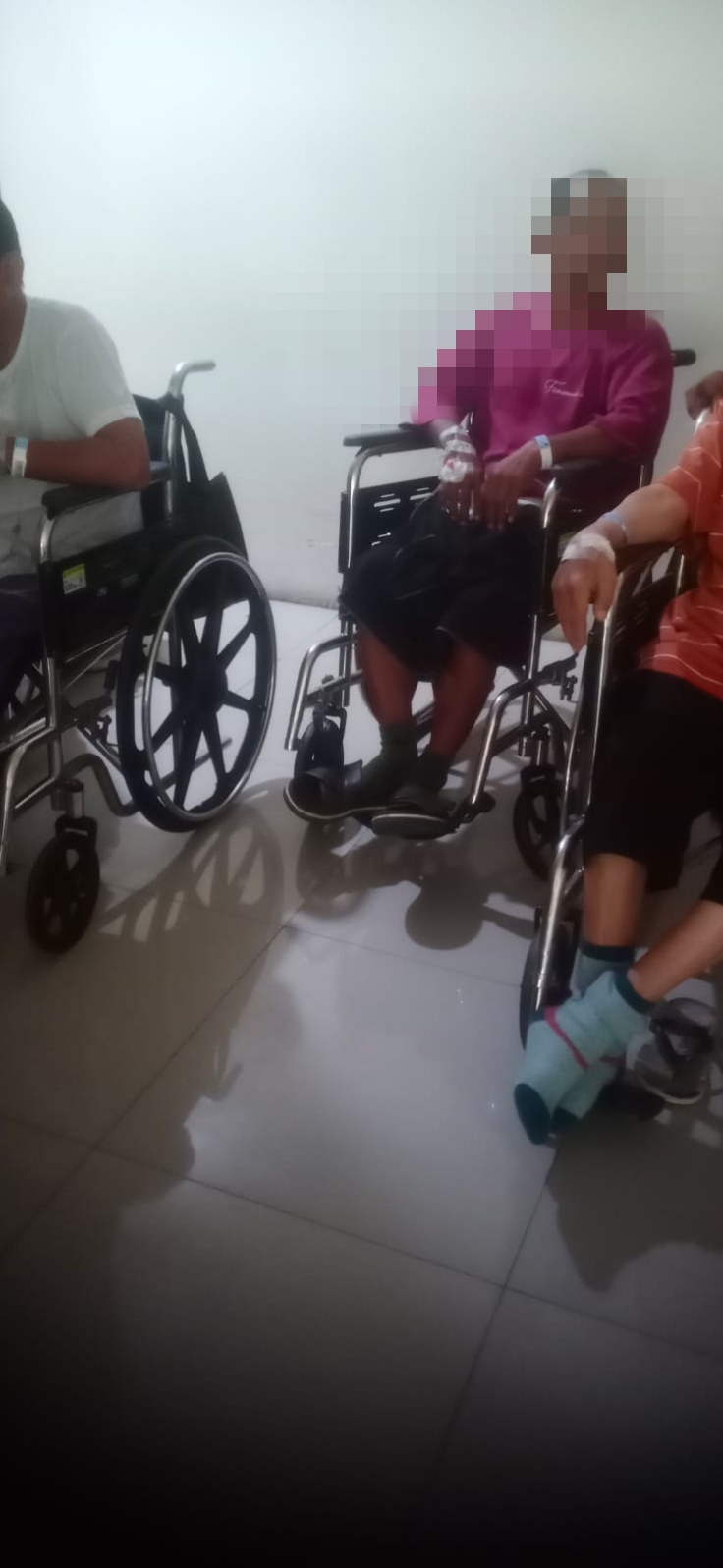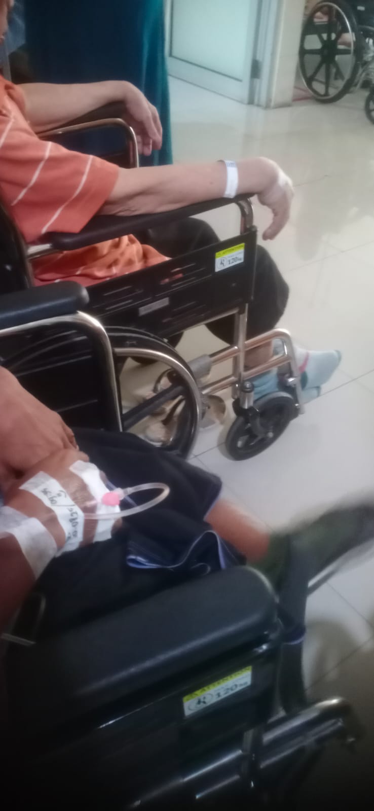 Pemandangan memprihatinkan terlihat di area rumah sakit. Seorang pasien terpaksa duduk di kursi roda dengan satu kaki menginjak rangka, karena bagian penopang kakinya rusak. Posisi tersebut jelas berbahaya dan berpotensi menyebabkan pasien jatuh atau mengalami cedera tambahan.