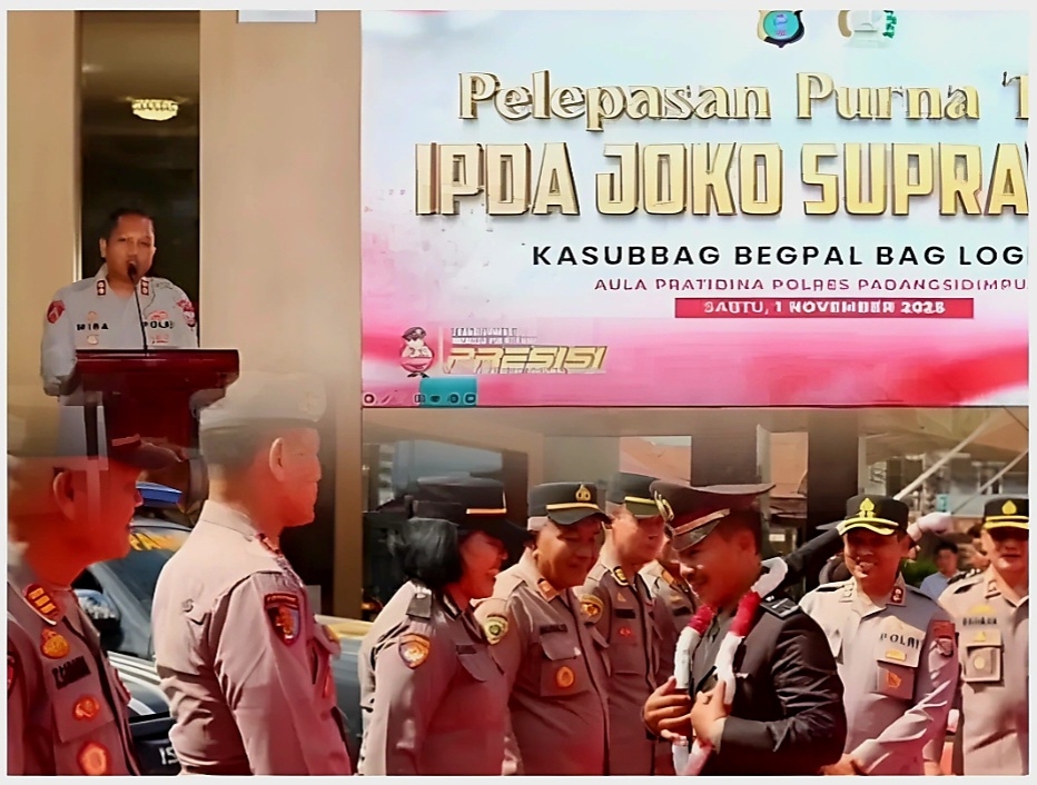 Padangsidimpuan, Sumut: analisasiber.com, – Pada hari Sabtu, 01 November 2025, bertempat di Aula Polres Padangsidimpuan, telah berlangsung upacara pelepasan purna tugas yang penuh haru, penghargaan bagi IPDA Joko Suprayitno, Kasubbag Begpal Baglog Polres Padangsidimpuan. Acara yang dipimpin oleh Kapolres Padangsidimpuan, AKBP Dr. Wira Prayatna, S.H., S.I.K., M.H.,