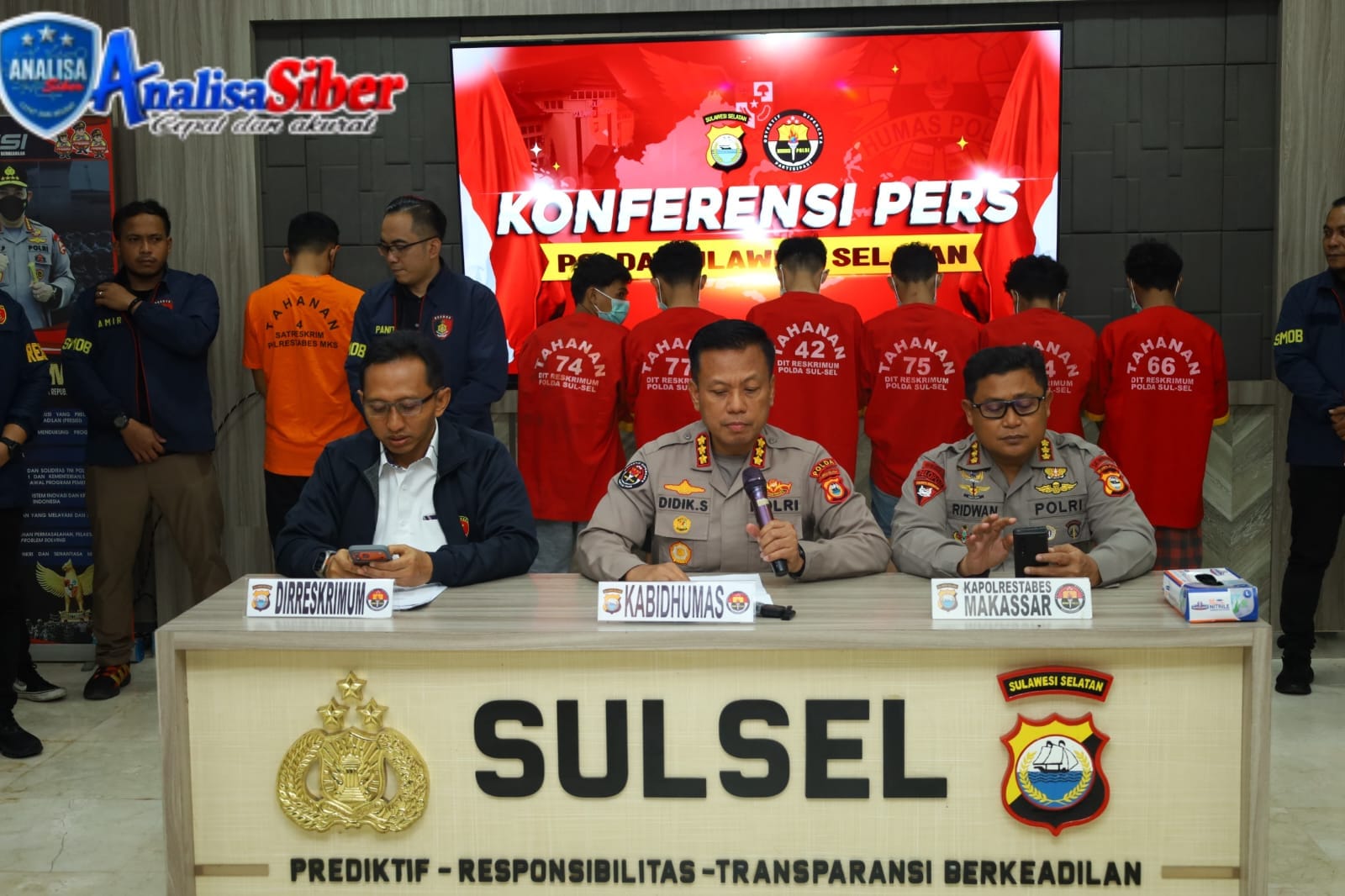 Press release dipimpin oleh Kabid Humas Polda Sulsel Kombes Pol. Didik Supranoto, S.I.K., M.H., didampingi Dirreskrimum Polda Sulsel Kombes Pol. Setiadi Sulaksono, S.I.K., M.H., serta Plt Kapolrestabes Makassar Kombes Pol. Muhammad Ridwan, S.I.K., M.H.