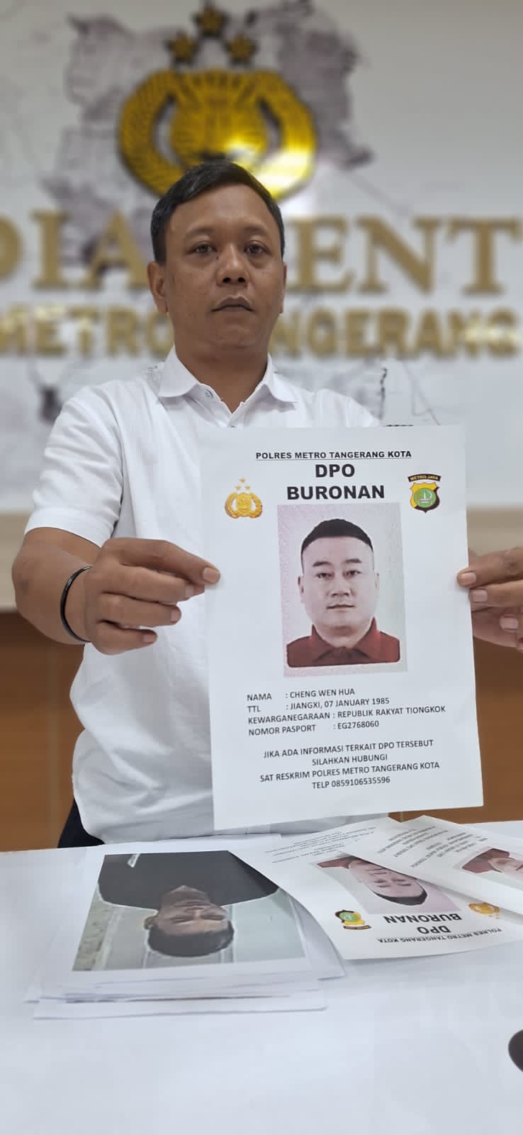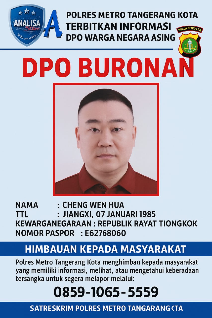 Polres Metro Tangerang Kota melalui Satuan Reserse Kriminal (Satreskrim) secara resmi mengumumkan Daftar Pencarian Orang (DPO) terhadap seorang warga negara asing bernama Cheng Wen Hua, yang diduga terlibat kasus pencurian dengan pemberatan sebagaimana diatur dalam Pasal 363 KUHP.
