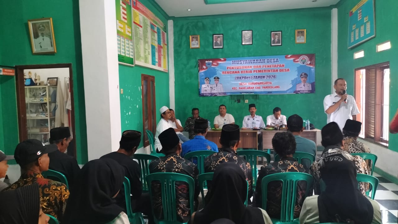 Pemerintah Desa Harapan Karya, Kecamatan Pagelaran, Kabupaten Pandeglang, Provinsi Banten, menggelar Musyawarah Desa (Musdes) dalam rangka penyusunan dan penetapan Rencana Kerja Pemerintah Desa (RKPDes) Tahun 2026, bertempat di Aula Kantor Desa Harapan Karya, Rabu (4/11/2025).