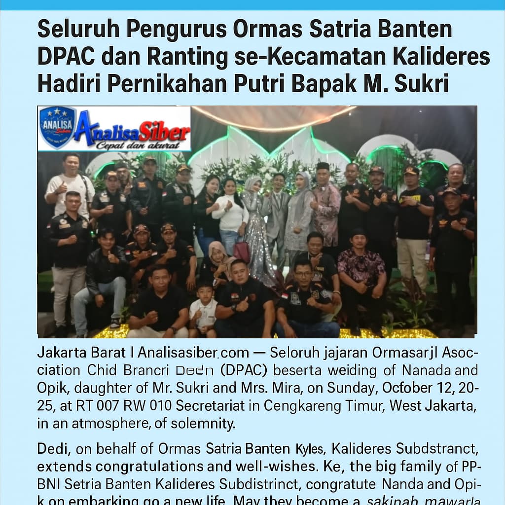 Jakarta Barat | Analisasiber.com — Seluruh jajaran pengurus Organisasi Masyarakat (Ormas) PPBNI Satria Banten Dewan Pimpinan Anak Cabang (DPAC) beserta ranting se-Kecamatan Kalideres menghadiri acara pernikahan pasangan Nanda dan Opik, putri tercinta dari Bapak M. Sukri dan Ibu Mira.