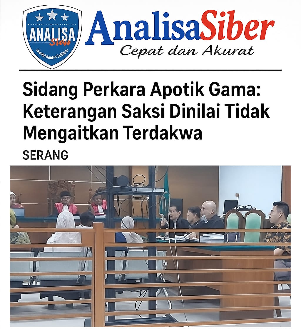 SERANG, Analisasiber.com – Sidang lanjutan kasus Apotik Gama kembali digelar di Pengadilan Negeri (PN) Serang, Selasa (30/9/2025), dengan agenda mendengarkan keterangan saksi dari Jaksa Penuntut Umum (JPU).