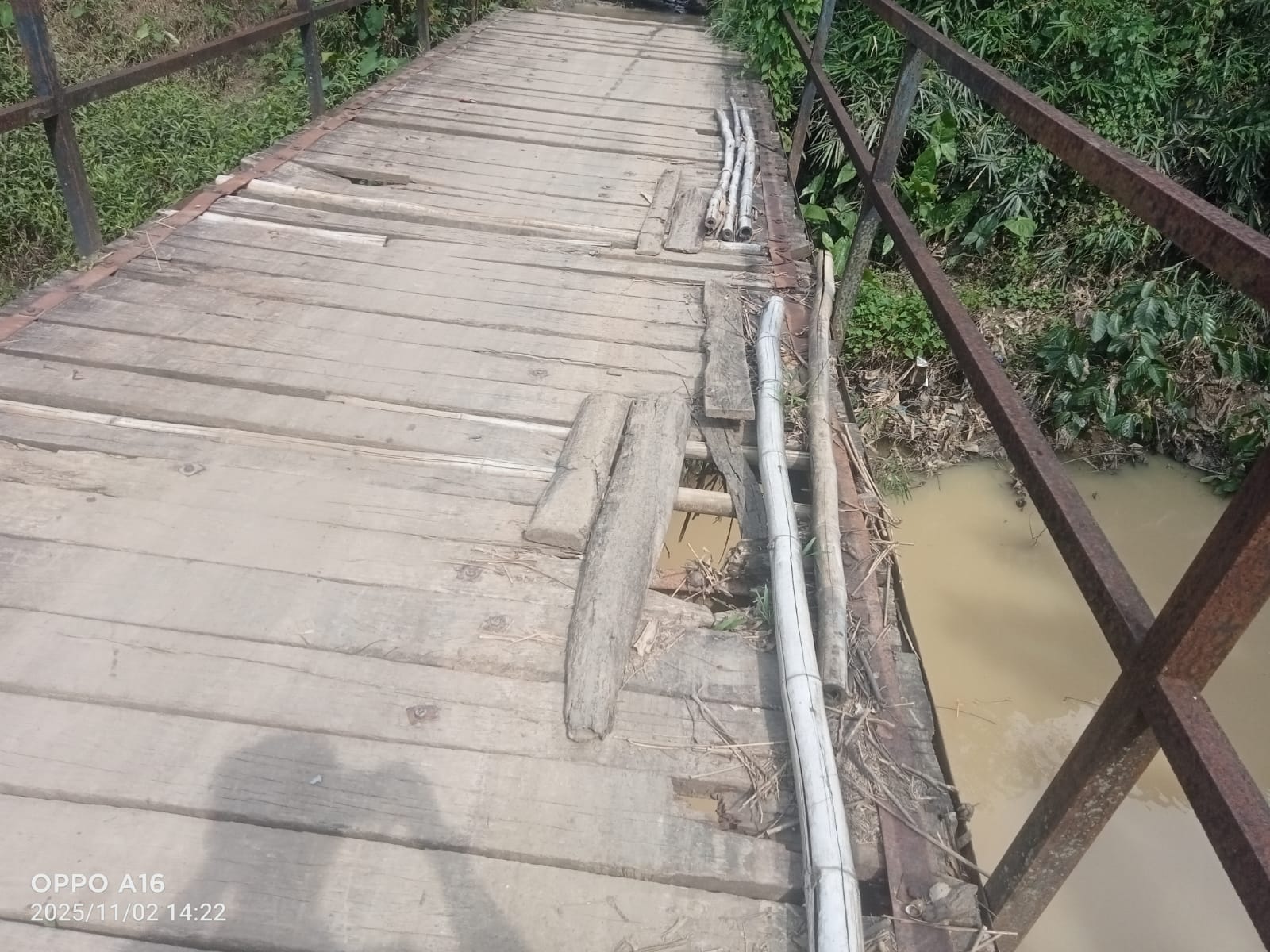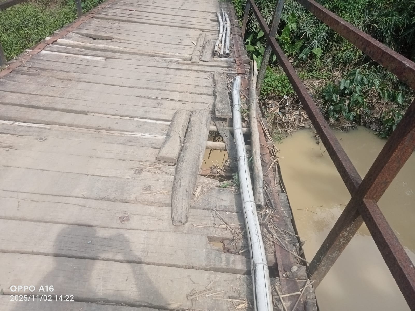 Jembatan tersebut merupakan jalur vital yang setiap hari dilalui kendaraan roda dua maupun roda empat. Namun, lantaran sudah lama tidak mendapatkan perhatian dan perbaikan dari pihak terkait, sejumlah bagian jembatan tampak rusak berat—kayu penyangga mulai lapuk, permukaan berlubang, dan sebagian struktur besinya berkarat.